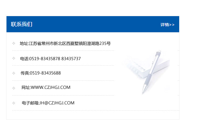 地址:常州市新北區友邦商務大廈1幢16、17層  電話:0519-85101652  傳真:0519-85112595  郵編:213022  網址:www.cz-jiayue_cn.nkgongneng.com  郵箱:xiajifengaa@163.com